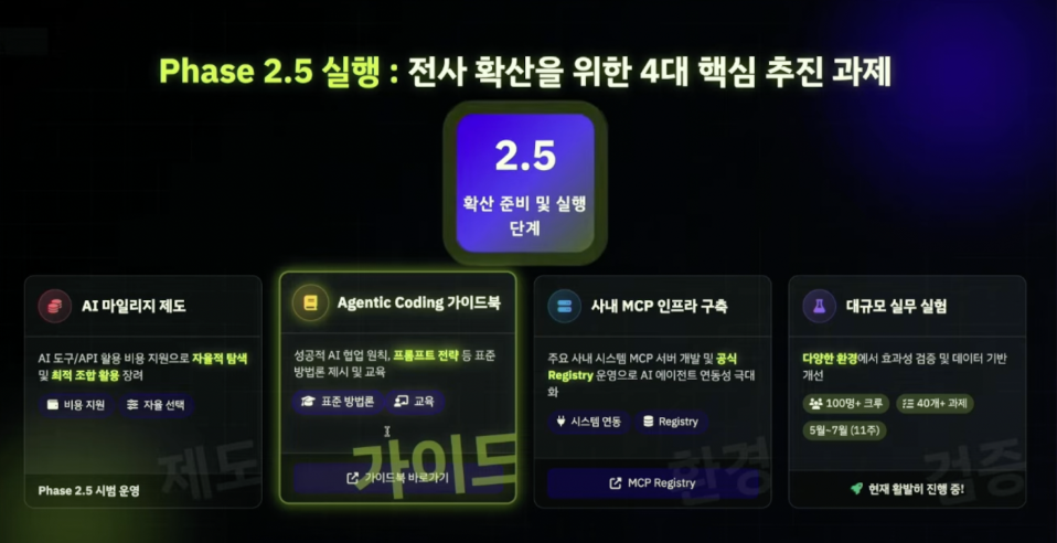 - 목표: 다양한 기술과 팀, 환경에서 AI 코딩의 효과를 검증하고, 전사적 확산을 위한 인프라와 가이드를 구축하는 것이에요.