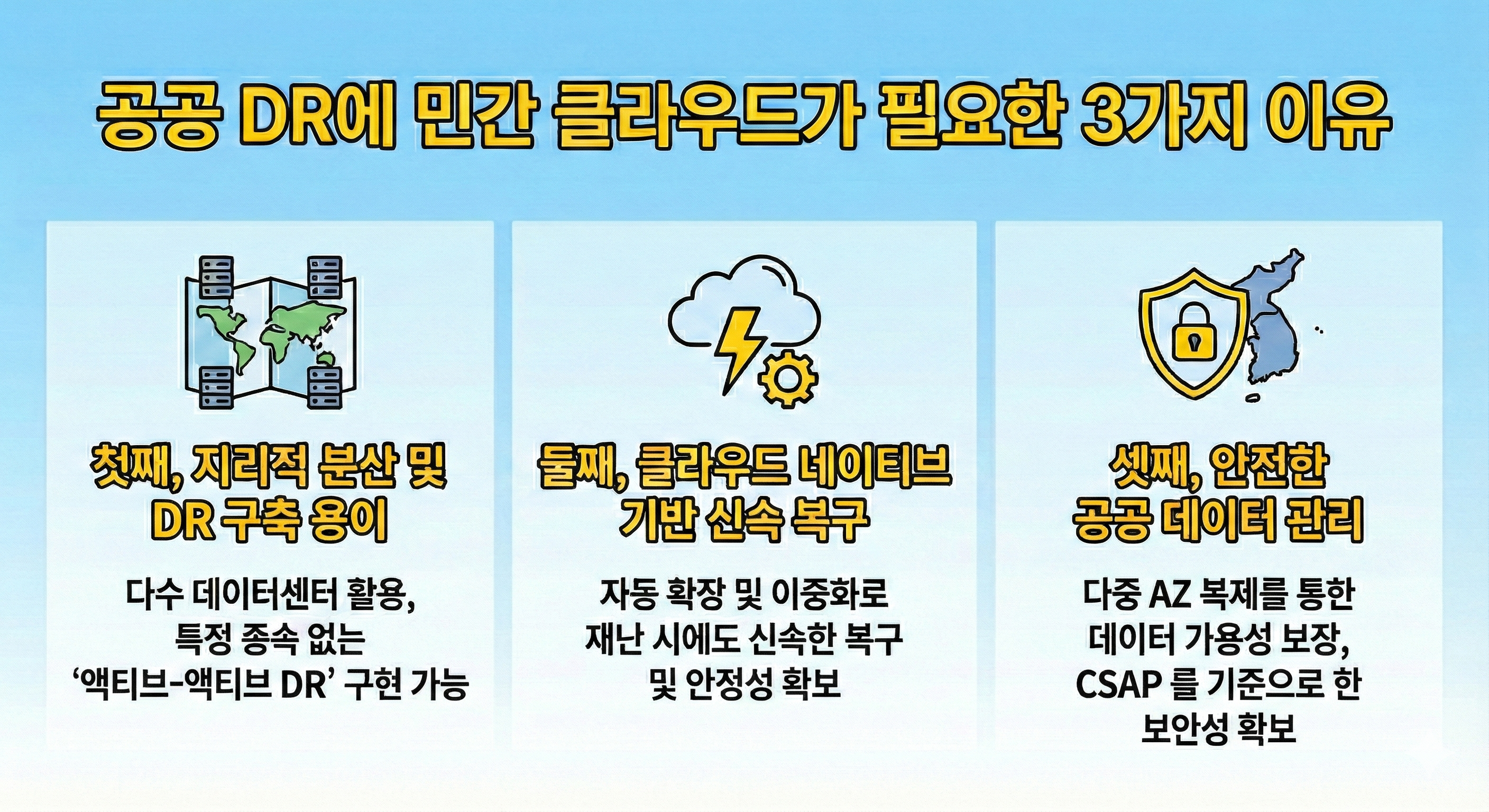 공공DR에 다수의 데이터센터, 클라우드 네이티브 기반, 데이터 안전성의 강점을 가진 민간 클라우드의 역할이 강조되고 있습니다.