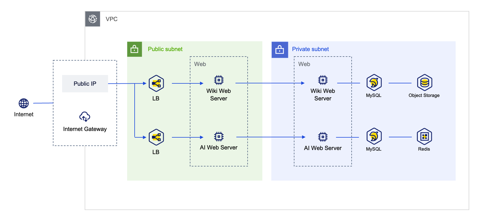 WIKI서비스는 Node.js와 MySQL을 사용하여 개발되었으며, 서비스 특성상 대용량 데이터를 효율적으로 처리하기 위해 Object Storage를 사용하였습니다. AI챗봇 서비스는 Django와 벡터 데이터베이스로 Redis를 사용했습니다. 아무래도 여러 기술 스택이 사용되다보니, 각 서비스의 특징에 맞게 개발환경을 구성해야했습니다. 카카오클라우드에서 제공하는 서비스들(Virtual Machine, Data Store, Beyond Storage Service)을 조합하여 간편하게 개발환경을 설정할 수 있어 빠르게 개발을 진행할 수 있었습니다.